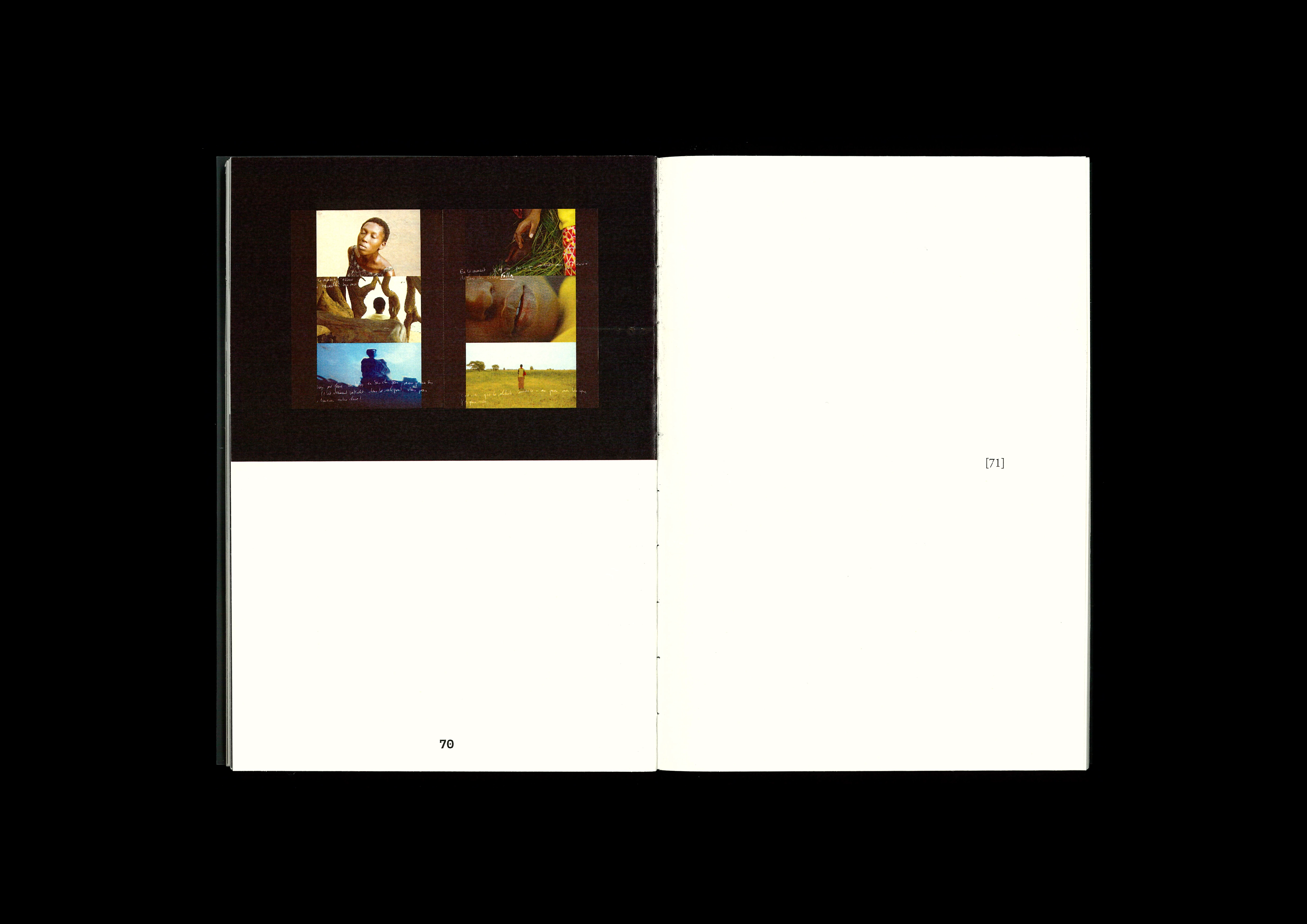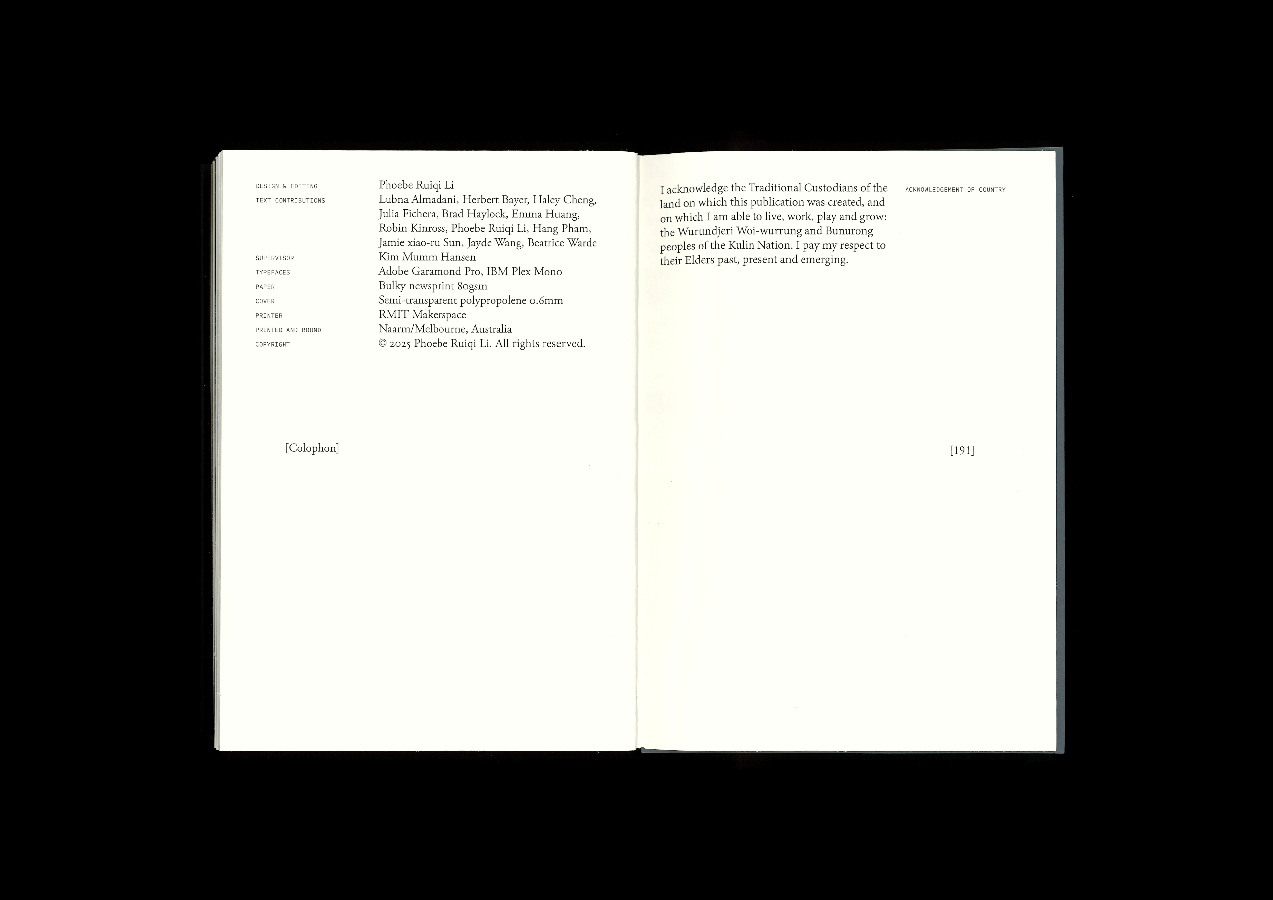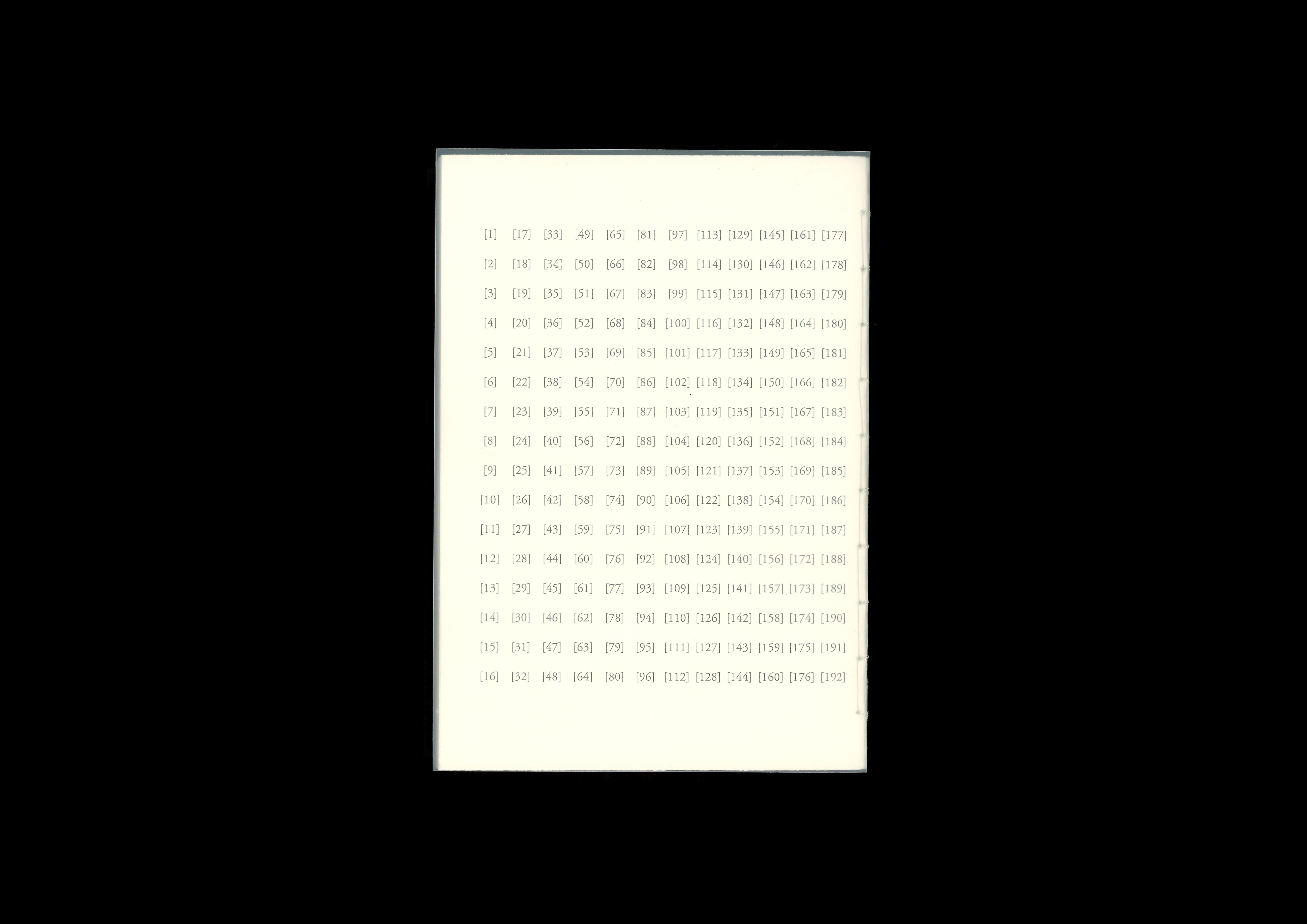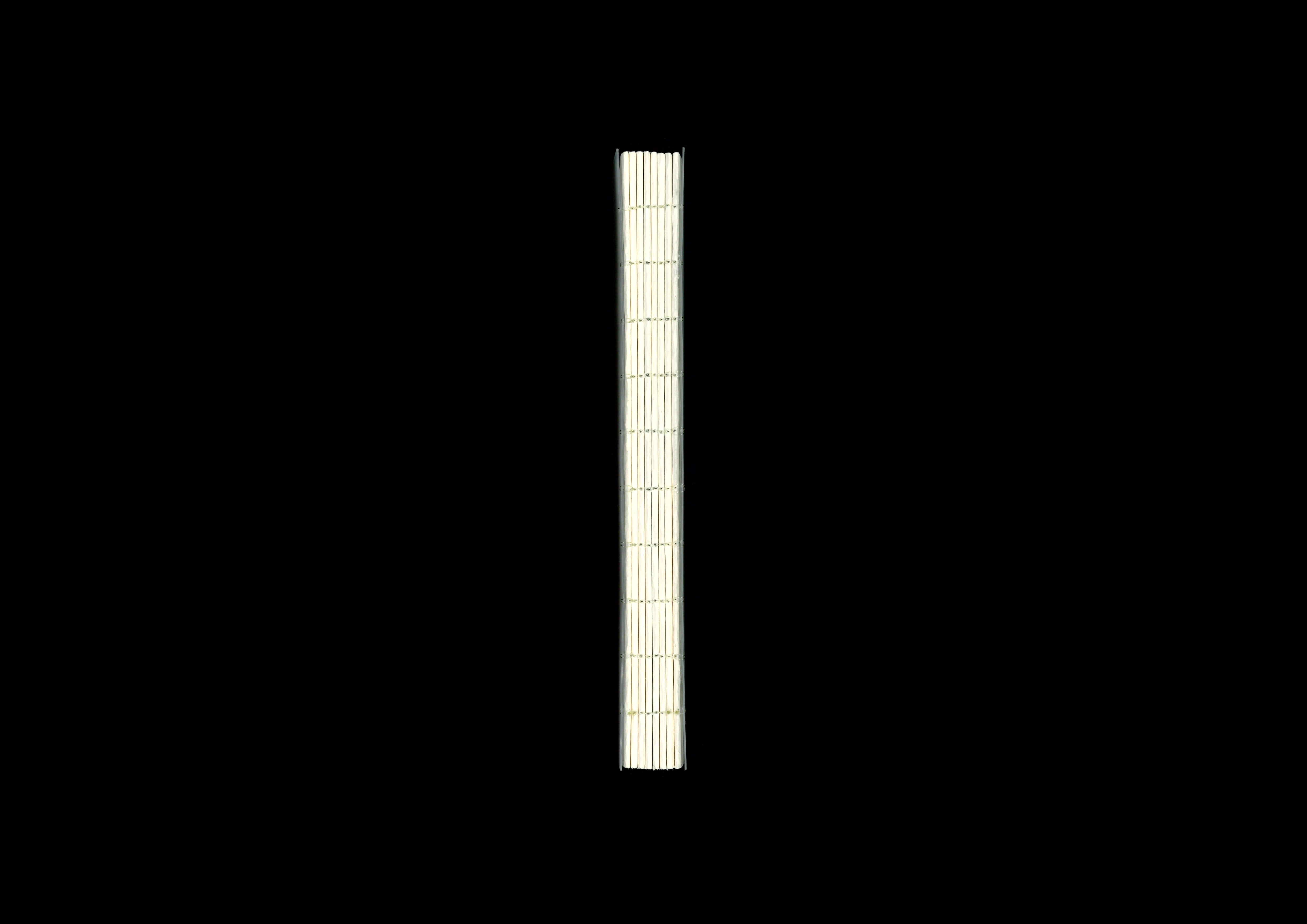 Printed on bulky newsprint and semi-transparent polypropolene; handbound with fishing wire.